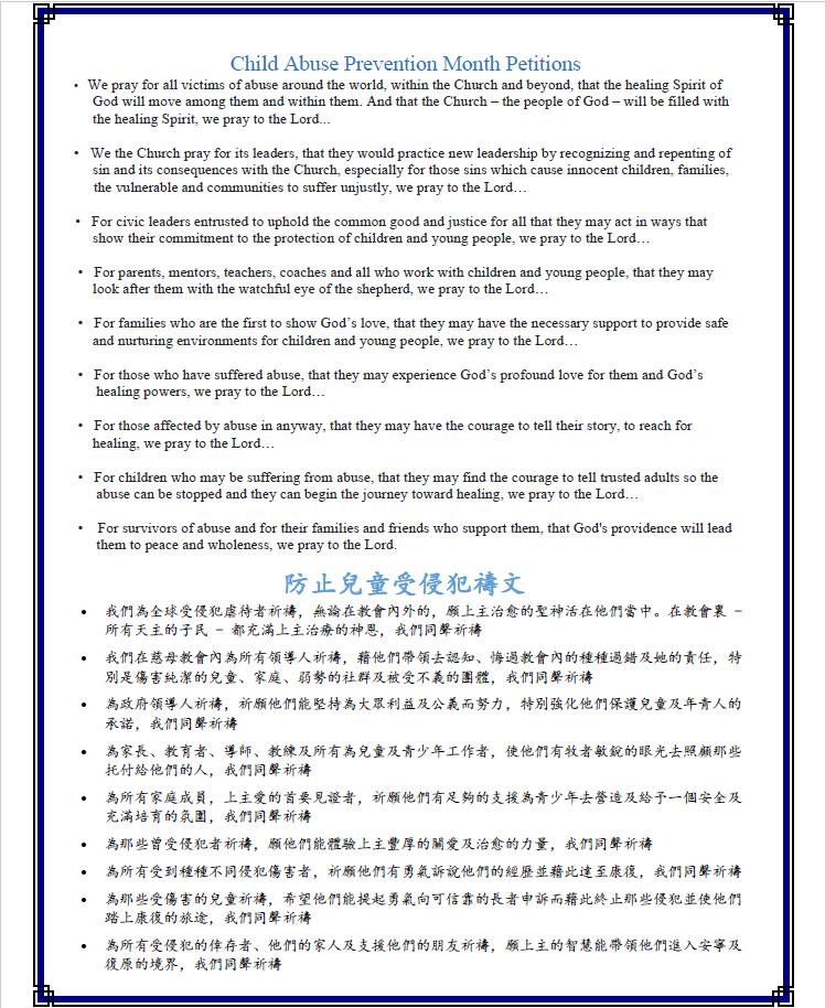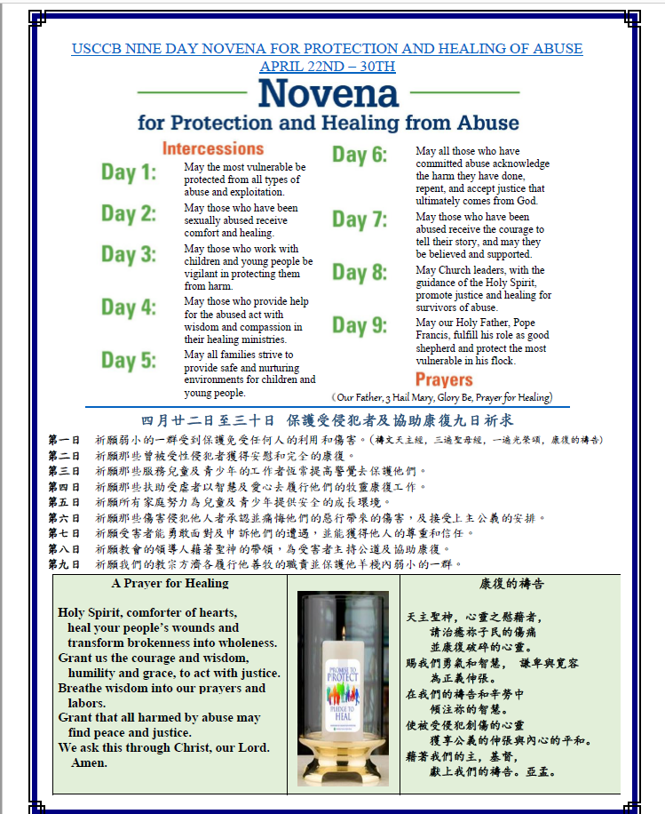 6) 總主教 Gomez 希望各位天主教徒聯同他一起從四月廿二至三十日為所有在教會內受性侵犯的倖存者及家人祈禱。請看九日敬禮禱文於後頁。