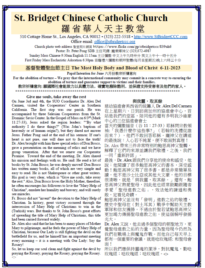5) June 16th (Friday): The Solemnity of Most Sacred Heart of Jesus, there will be Mass at 7:30pm. All are welcome.