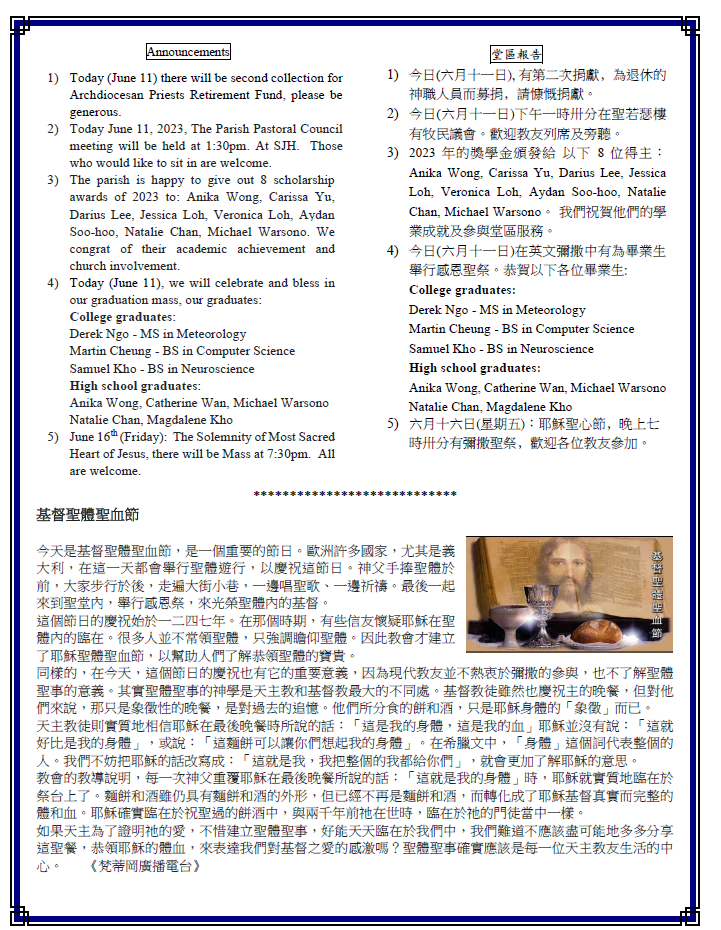1) Today (June 11) there will be second collection for Archdiocesan Priests Retirement Fund, please be generous.