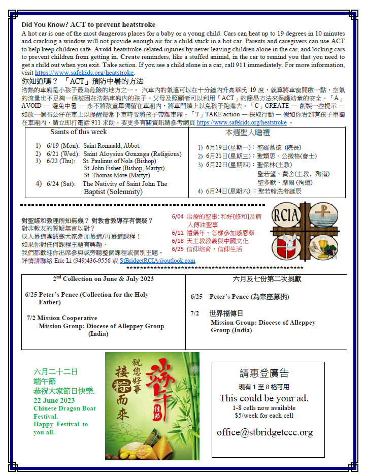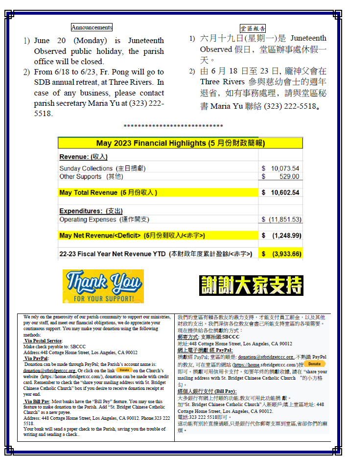 1) 六月十九日(星期一)是Juneteenth Observed 假日﹐堂區辦事處休假一天。