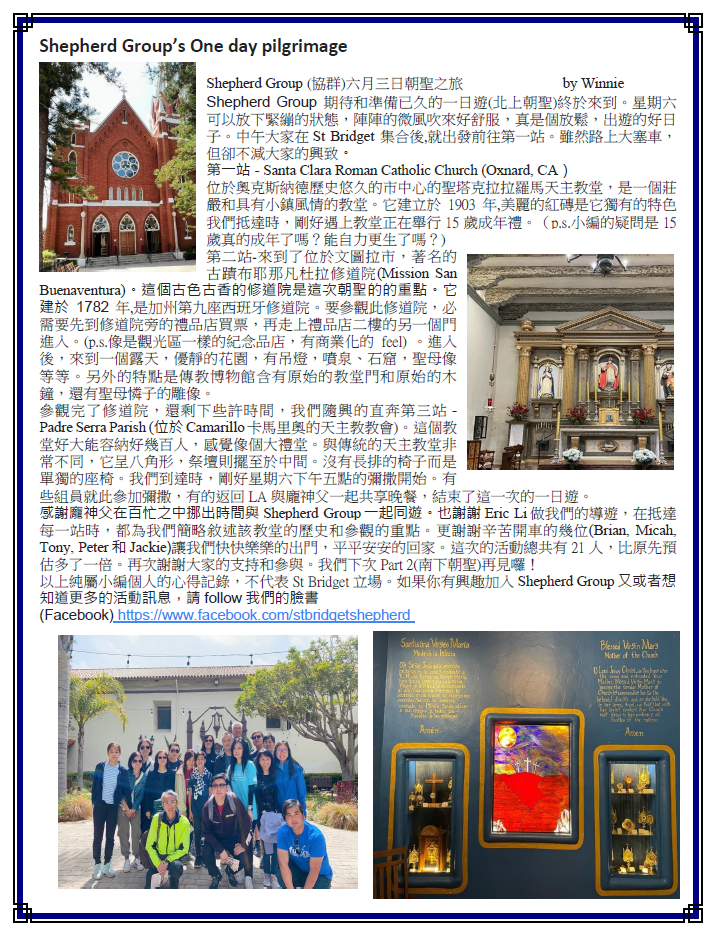 2) From 6/18 to 6/23, Fr. Pong will go to SDB annual retreat, at Three Rivers. In case of any business, please contact parish secretary Maria Yu at (323) 222-5518.
