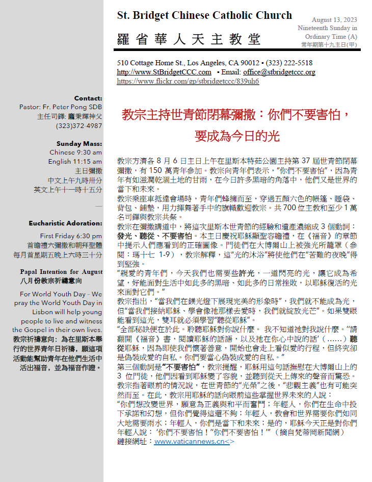 常年期第十九主日(甲) Nineteenth Sunday in Ordinary Time (A)8-13-2023