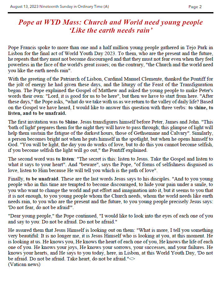 3) August 15 (Monday) is the Solemnity of the Assumption of the Blessed Virgin Mary, this is a day of Obligation, we will have Mass at 7:30pm in honor of the Blessed Virgin Mary, you are all most welcome.