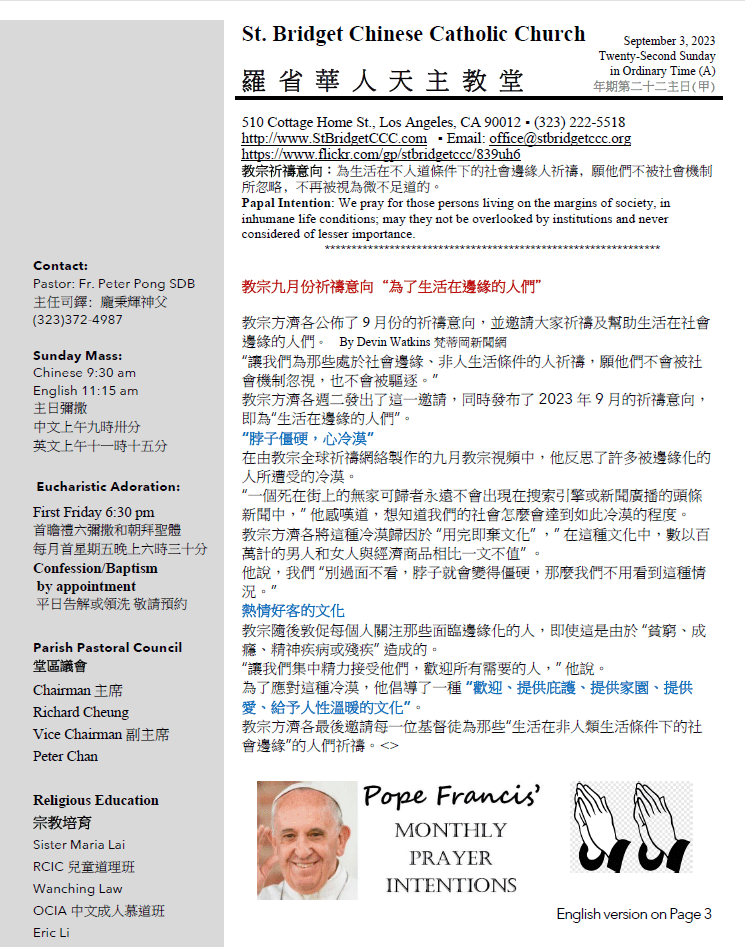1)九月四日(星期一): 勞工節﹐公眾假期﹐堂區辦事處休假一天。如有要事﹐請與林神父聯絡:(415) 579-7452。