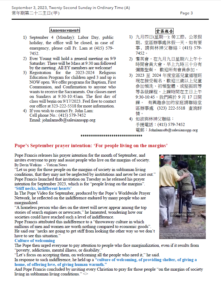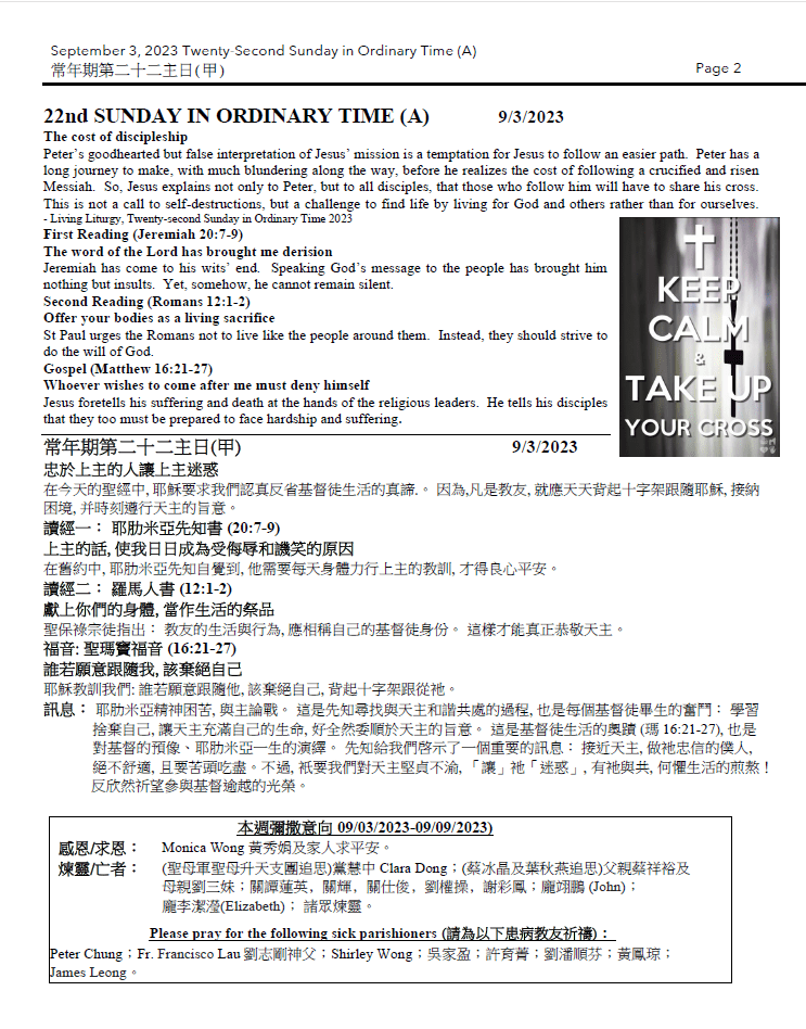 常年期第二十二主日 (甲) Twenty-Second Sunday in Ordinary Time (A)09-03-2023