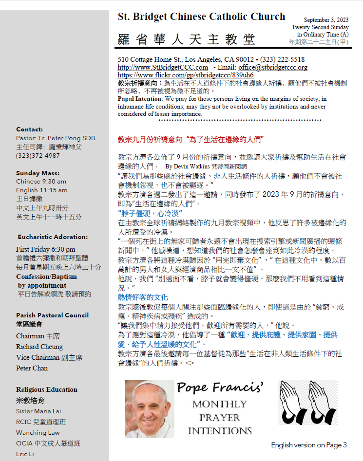 1)九月四日(星期一): 勞工節﹐公眾假期﹐堂區辦事處休假一天。如有要事﹐請與林神父聯絡:(415) 579-7452。