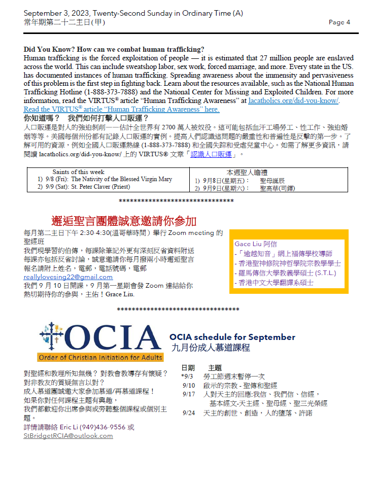 常年期第二十二主日 (甲) Twenty-Second Sunday in Ordinary Time (A)09-03-2023