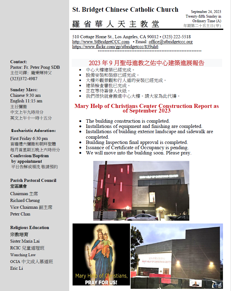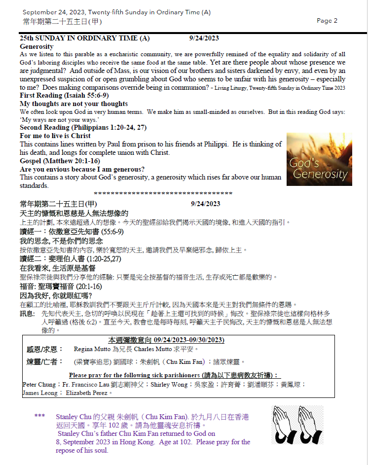 常年期第二十五主日 (甲) Twenty-Fifth Sunday in Ordinary Time (A)09-24-2023