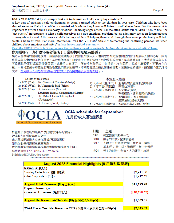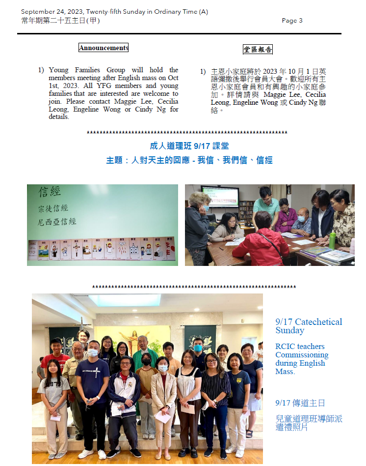 常年期第二十五主日 (甲) Twenty-Fifth Sunday in Ordinary Time (A)09-24-2023
