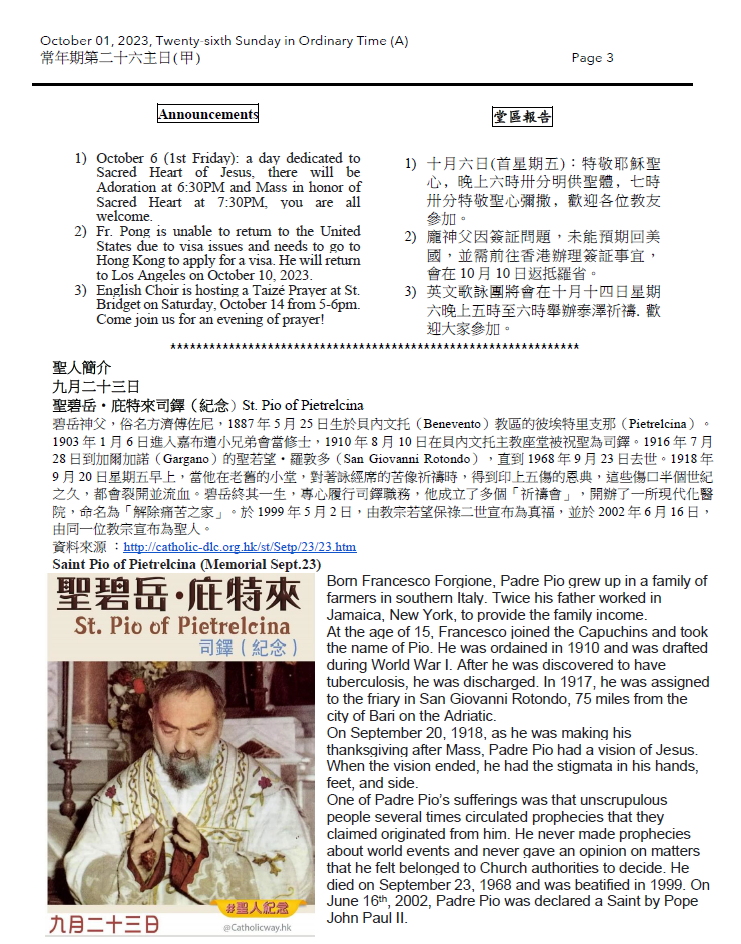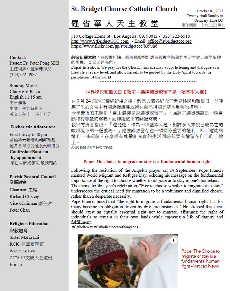 常年期第二十六主日 (甲) Twenty-Sixth Sunday in Ordinary Time (A)10-01-2023
