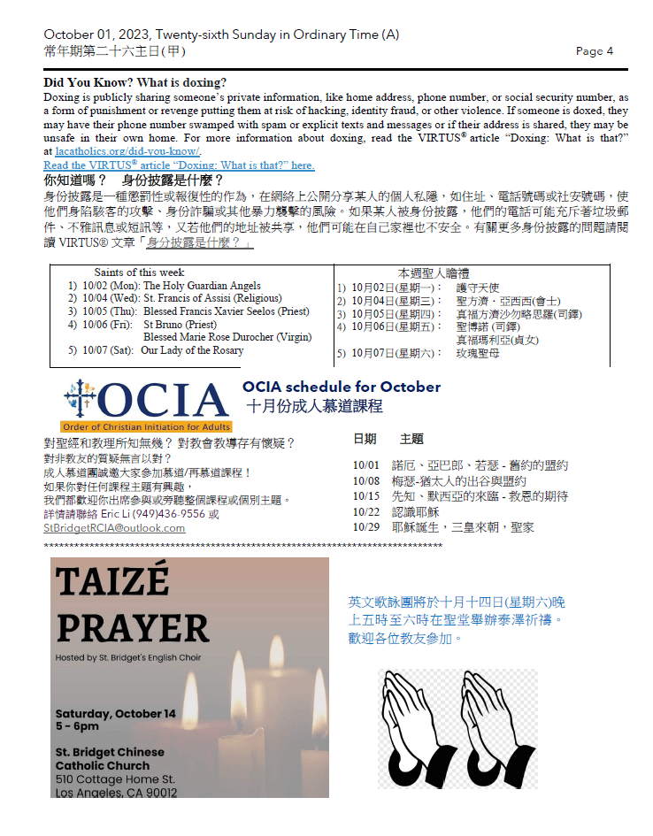 3)English Choir is hosting a Taizé Prayer at St. Bridget on Saturday, October 14 from 5-6pm. Come join us for an evening of prayer!