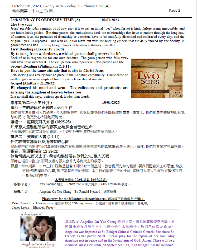 常年期第二十六主日 (甲) Twenty-Sixth Sunday in Ordinary Time (A)10-01-2023