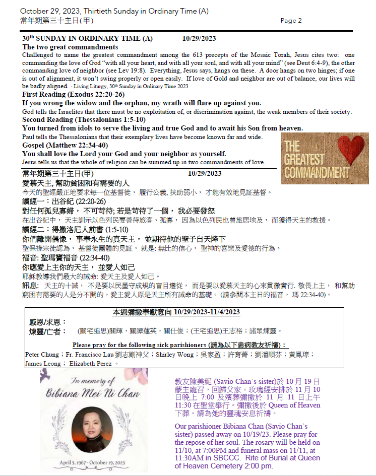 常年期第三十主日 (甲) Thirtieth Sunday in Ordinary Time (A)10-29-2023