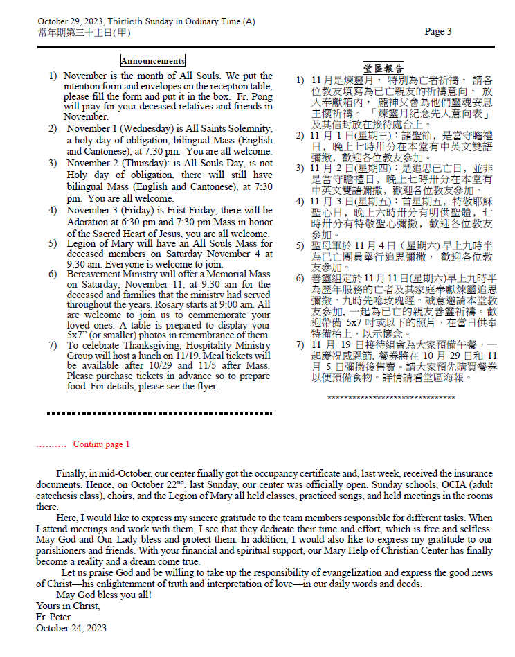 2)November 1 (Wednesday) is All Saints Solemnity, a holy day of obligation, bilingual Mass (English and Cantonese), at 7:30 pm. You are all welcome.