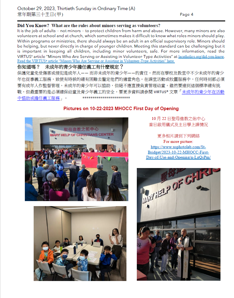 3)November 2 (Thursday): is All Souls Day, is not Holy day of obligation, there will still have bilingual Mass (English and Cantonese), at 7:30 pm. You are all welcome.