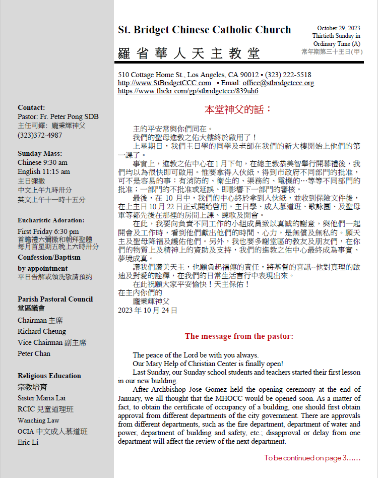 2)November 1 (Wednesday) is All Saints Solemnity, a holy day of obligation, bilingual Mass (English and Cantonese), at 7:30 pm. You are all welcome.