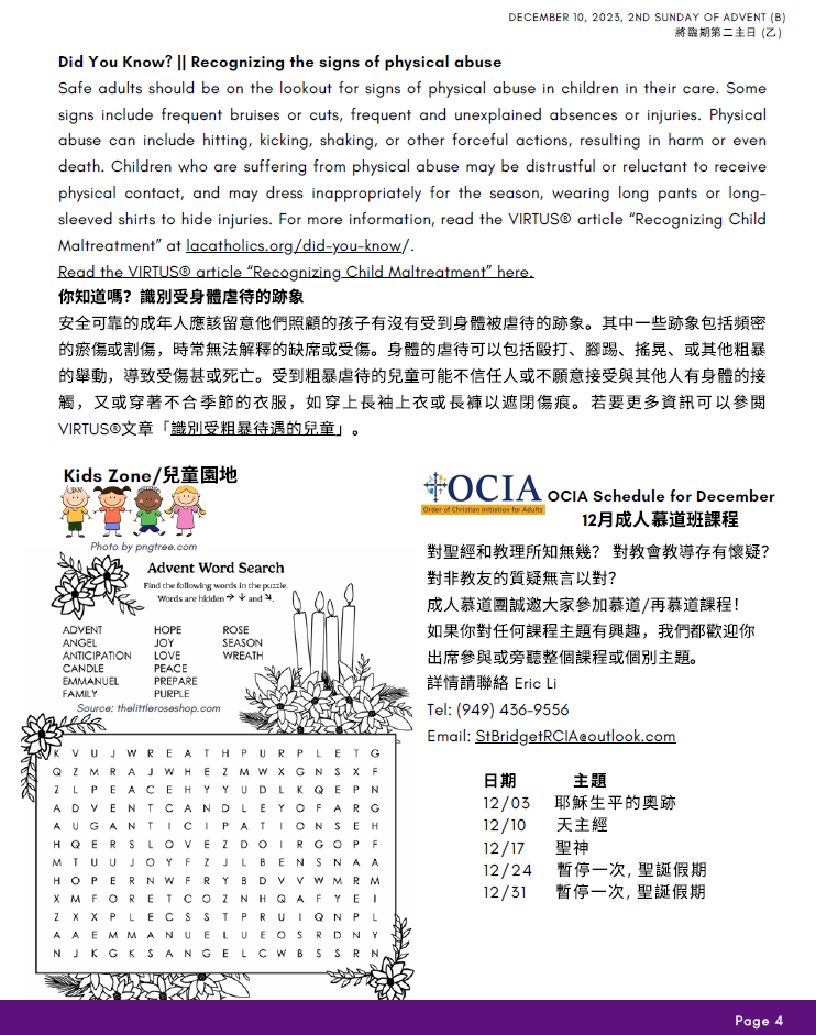 3.The Holy Family Society members meeting and the Officers Election for the next two-years term 2024-2025 will be held on Dec30th, 2023 (Saturday) at 10:45 am. There’s a Mass at 9:30 am before the meeting, please come and join.