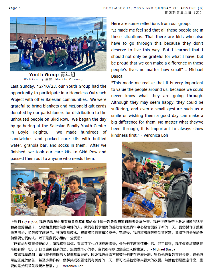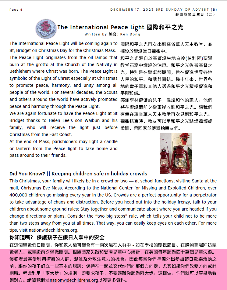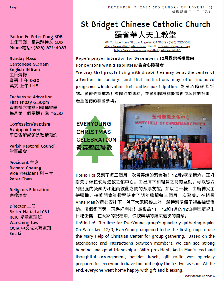- The Holy Family Society members meeting and the Officers Election for the next two- years term 2024-2025 will beheld on Dec 30th, 2023 (Saturday) at10:45 am. There’s a Mass at 9:30 am before the meeting, please come and join. After the meeting, we’ll have a luncheon gathering. Fee will be$5/person. Please sign up with Eva Yuenor Maria Yu. The deadline is 12/24/2023.