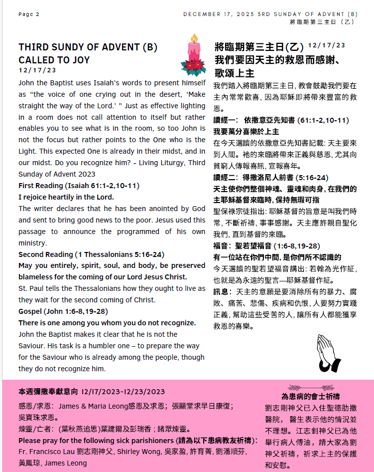 2.2024 的堂區捐獻信封已凖備好, 請各位教友彌撒後向財務組的成員索取。他們今天特設發放攤位方便大家。 2023的捐獻收據將會在2024年1 月下旬發放。