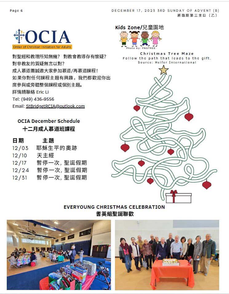 - The Holy Family Society members meeting and the Officers Election for the next two- years term 2024-2025 will beheld on Dec 30th, 2023 (Saturday) at10:45 am. There’s a Mass at 9:30 am before the meeting, please come and join. After the meeting, we’ll have a luncheon gathering. Fee will be$5/person. Please sign up with Eva Yuenor Maria Yu. The deadline is 12/24/2023.