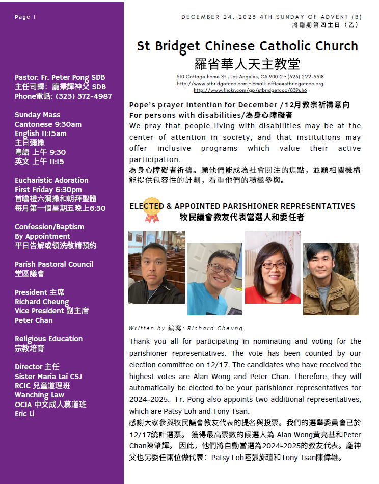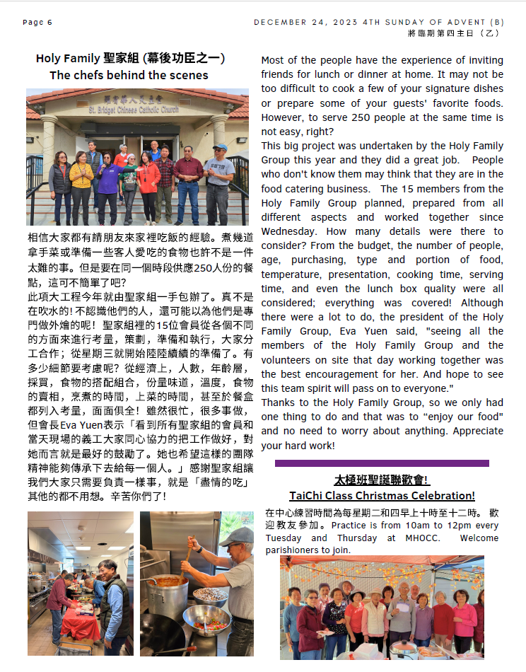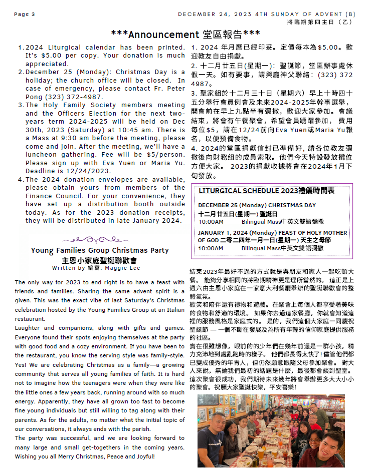 3.The Holy Family Society members meeting and the Officers Election for the next two-years term 2024-2025 will be held on Dec30th, 2023 (Saturday) at 10:45 am. There is a Mass at 9:30 am before the meeting, please come and join. After the meeting, we’ll have a luncheon gathering. Fee will be $5/person.Please sign up with Eva Yuen or Maria Yu.Deadline is 12/24/2023.