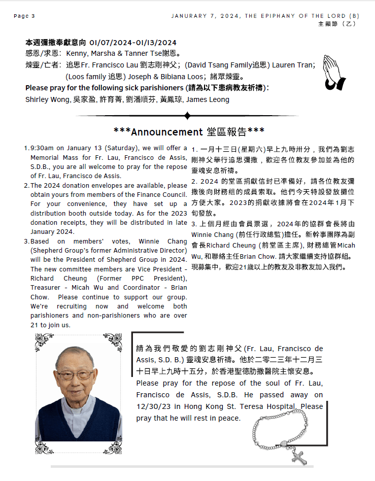 - 2024 的堂區捐獻信封已凖備好,請各位教友彌撒後向財務组的成員索取。他們今天特設發放攤位方便大家。2023的捐獻收據將會在2024年1月下旬發放。