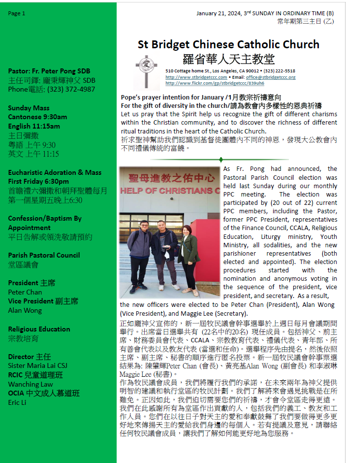 軍主日》的一部分,以表示童子軍的虔誠。請加入我們。 - 2月11日(大年初二),本堂將於早上十一時十五分舉行聖母進教之佑中心開幕典禮, 中英雙語彌撒,結婚週年紀念祝福禮及新春慶祝活動。誠邀各位教友及嘉賓一起慶祝新春佳節,享受傳統小吃、活動和遊戲。屆時將提供茶點招待。請於1月21,28日或2月4日在中文及英文彌撒後,在聖堂外索取免費門劵。詳情請參閱有關海報或與Maggie Lee聯絡。