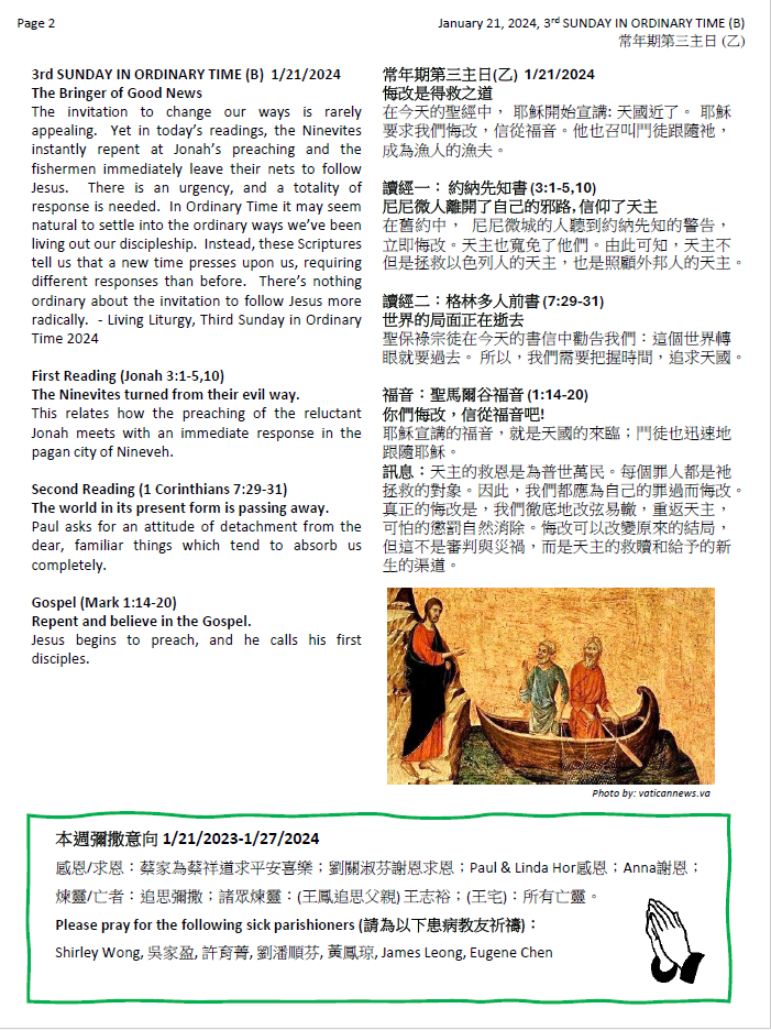 常年期第三主日(乙) 3rd SUNDAY IN ORDINARY TIME (B) 1-21-2024