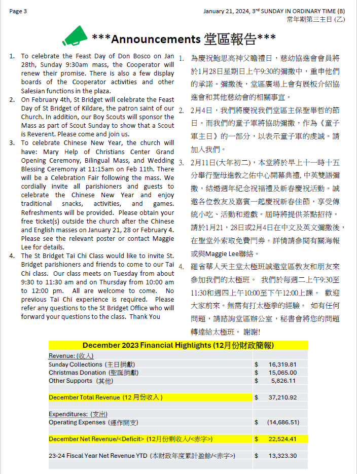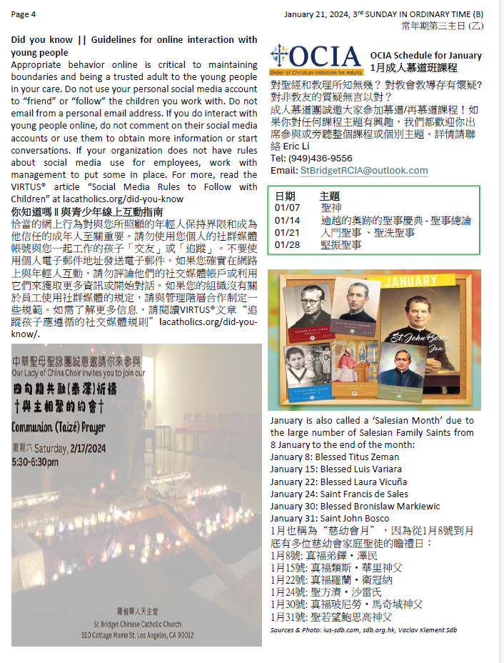 軍主日》的一部分,以表示童子軍的虔誠。請加入我們。 - 2月11日(大年初二),本堂將於早上十一時十五分舉行聖母進教之佑中心開幕典禮, 中英雙語彌撒,結婚週年紀念祝福禮及新春慶祝活動。誠邀各位教友及嘉賓一起慶祝新春佳節,享受傳統小吃、活動和遊戲。屆時將提供茶點招待。請於1月21,28日或2月4日在中文及英文彌撒後,在聖堂外索取免費門劵。詳情請參閱有關海報或與Maggie Lee聯絡。