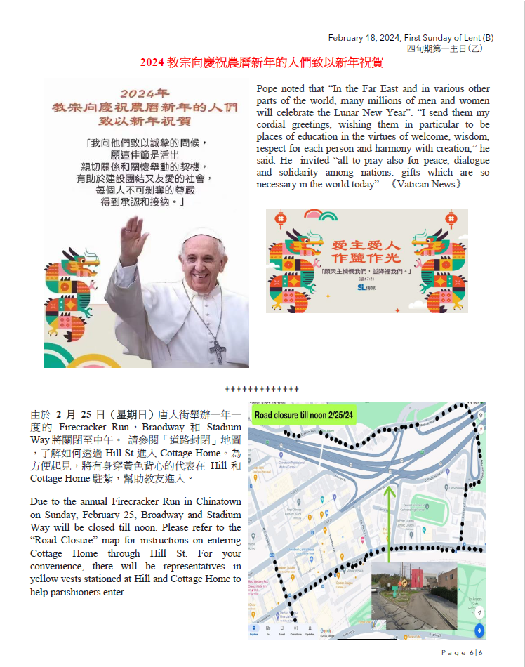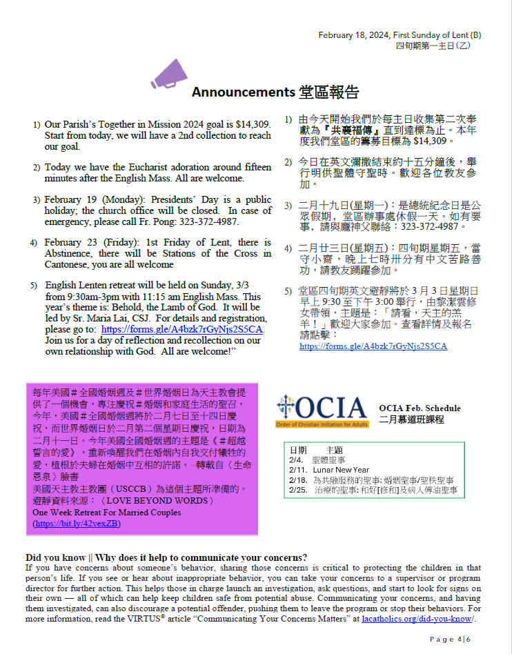 5)English Lenten retreat will be held on Sunday, 3/3 from 9:30am-3pm with 11:15 am English Mass. This year’s theme is: Behold, the Lamb of God. It will be led by Sr. Maria Lai, CSJ. For details and registration, please go to: https://forms.gle/A4bzk7rGyNjs2S5CA. Join us for a day of reflection and recollection on our own relationship with God. All are welcome!”