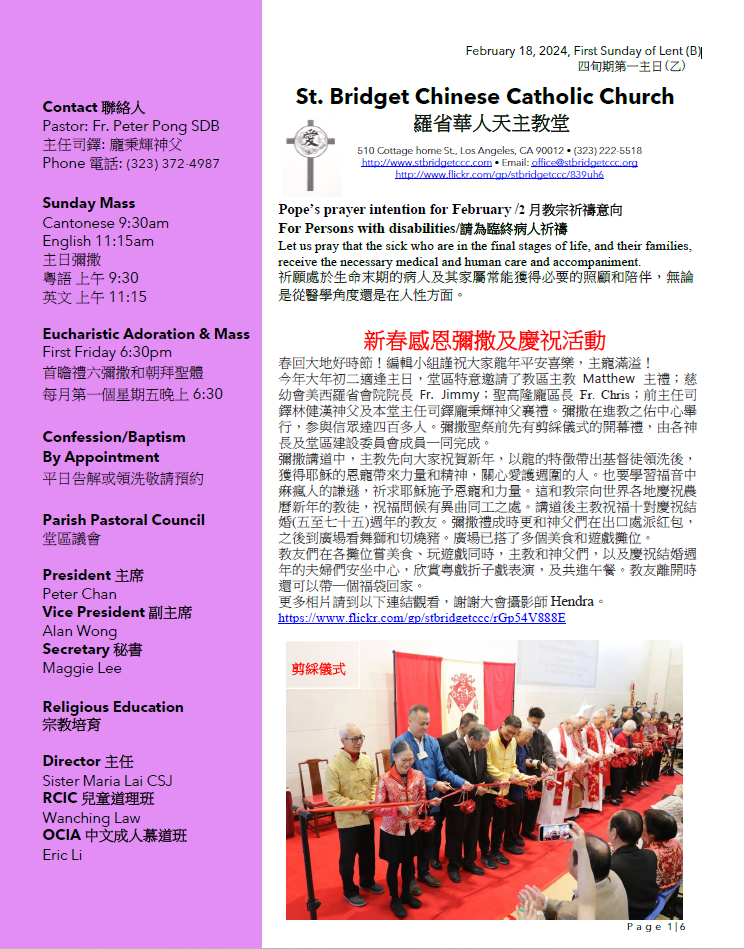 3)二月十九日(星期一):是總統紀念日是公眾假期﹐堂區辦事處休假一天。如有要事﹐請與龐神父聯絡:323-372-4987。