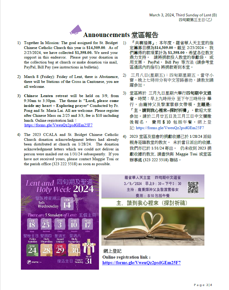 1)Together In Mission: The goal assigned for St. Bridget Chinese Catholic Church this year is $14,309.00. As of 2/25/2024, we have collected $1,398.00. We need your support in this endeavor. Please put your donation in the collection bag at church or make donation via mail, PayPal, Bill Pay (see instructions in bulletin).