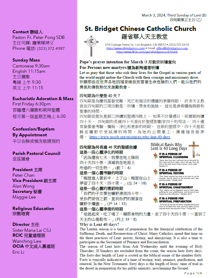 1)Together In Mission: The goal assigned for St. Bridget Chinese Catholic Church this year is $14,309.00. As of 2/25/2024, we have collected $1,398.00. We need your support in this endeavor. Please put your donation in the collection bag at church or make donation via mail, PayPal, Bill Pay (see instructions in bulletin).