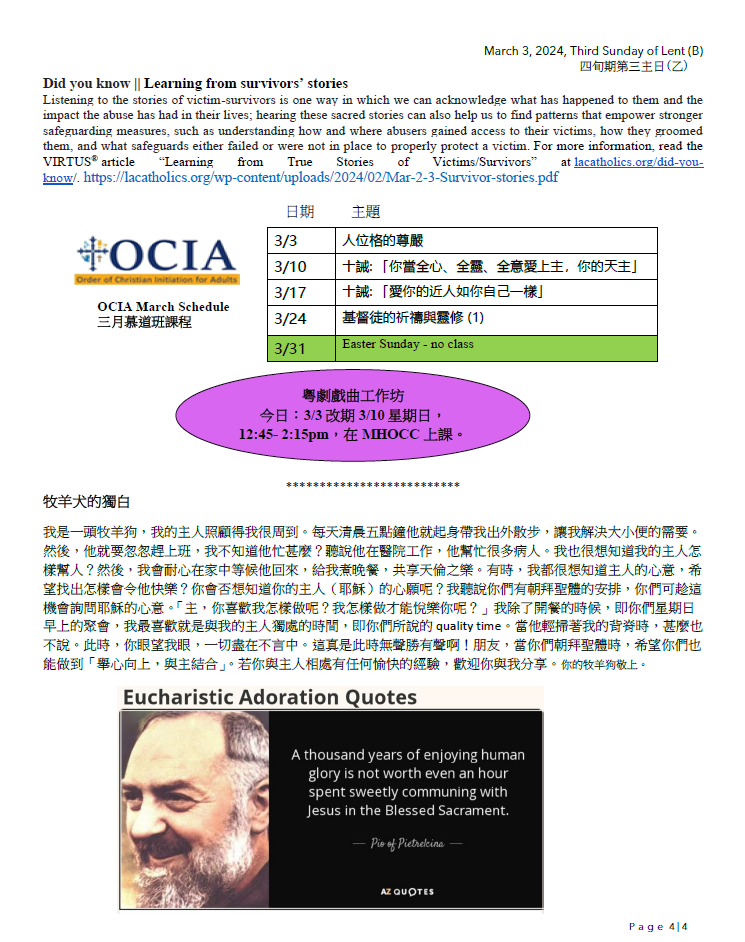 2)March 8 (Friday): Friday of Lent, there is Abstinence, there will be Stations of the Cross in Cantonese, you are all welcome.