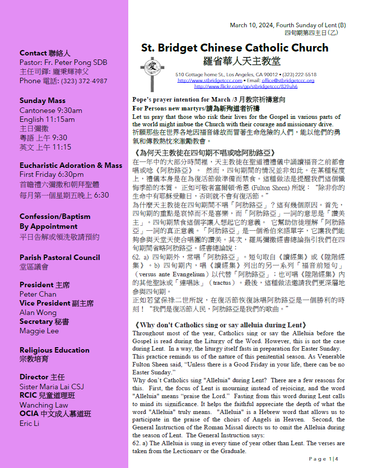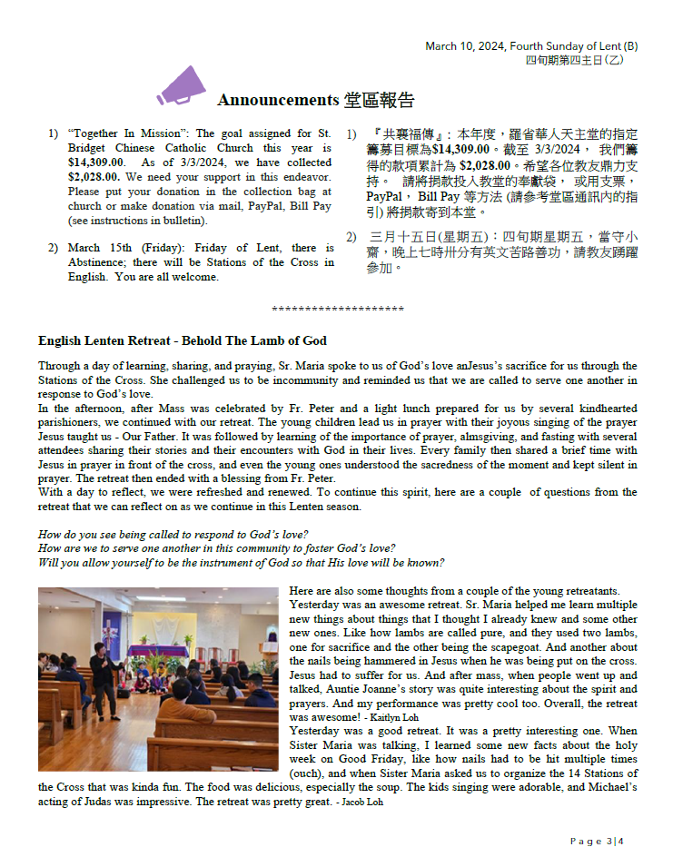 1)“Together In Mission”: The goal assigned for St. Bridget Chinese Catholic Church this year is $14,309.00. As of 3/3/2024, we have collected $2,028.00. We need your support in this endeavor. Please put your donation in the collection bag at church or make donation via mail, PayPal, Bill Pay (see instructions in bulletin).