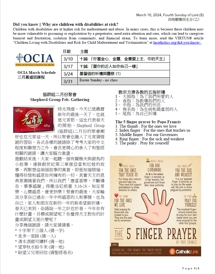 2)三月十五日(星期五):四旬期星期五,當守小齋,晚上七時卅分有英文苦路善功,請教友踴躍參加.