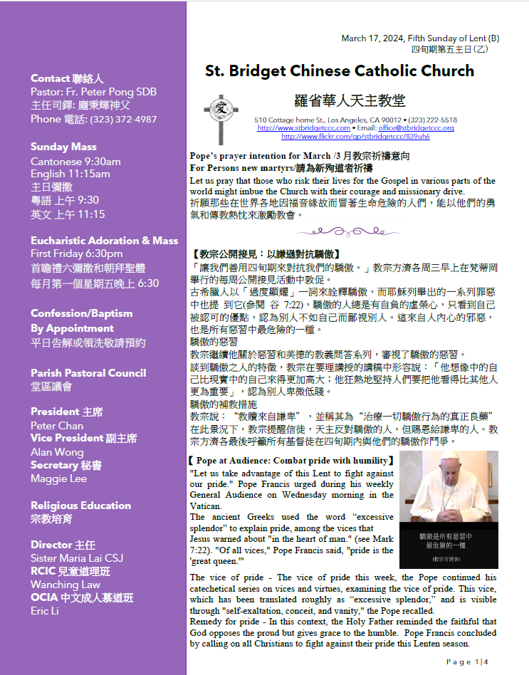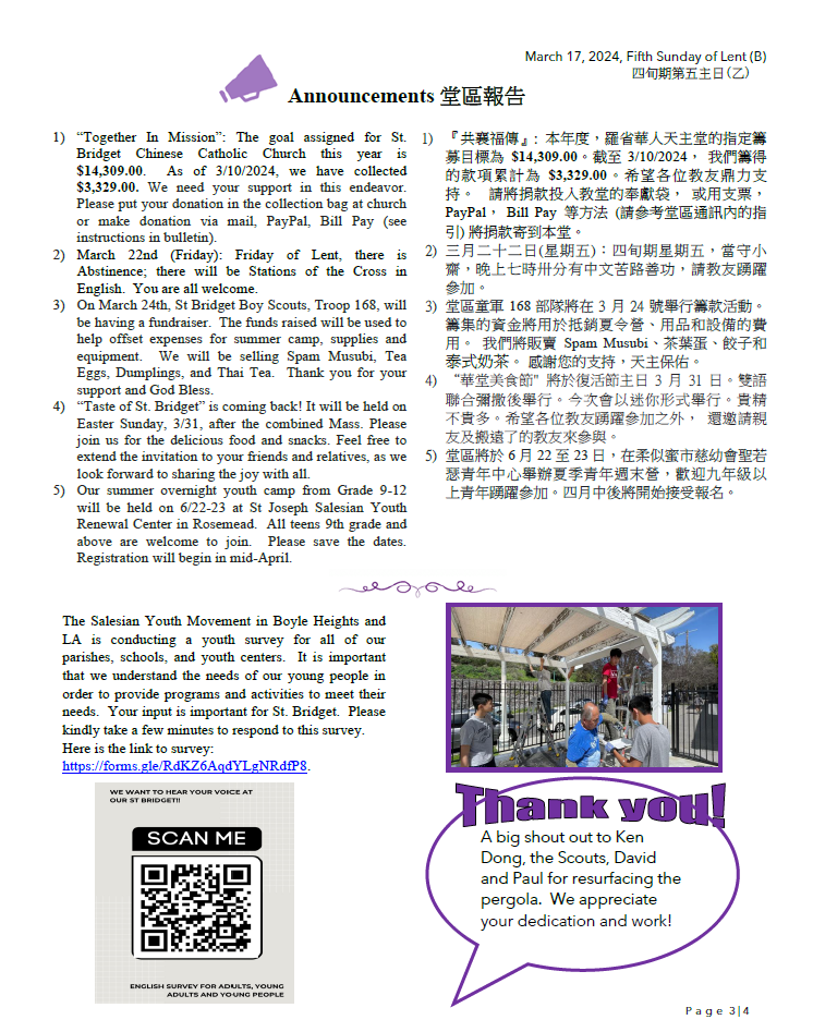 1)“Together In Mission”: The goal assigned for St. Bridget Chinese Catholic Church this year is $14,309.00. As of 3/10/2024, we have collected $3,329.00. We need your support in this endeavor. Please put your donation in the collection bag at church or make donation via mail, PayPal, Bill Pay (see instructions in bulletin).