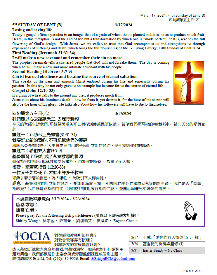 四旬期第五主日(乙) Fifth Sunday of Lent (B) 3-17-2024