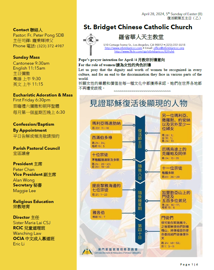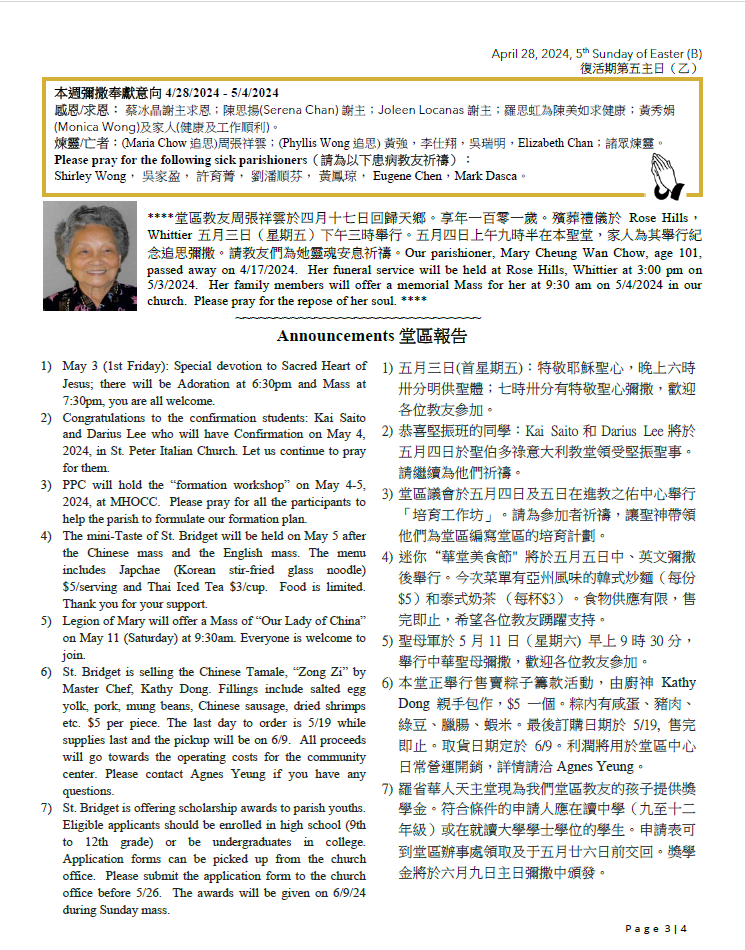 3)PPC will hold the “formation workshop” on May 4-5, 2024, at MHOCC. Please pray for all the participants to help the parish to formulate our formation plan.