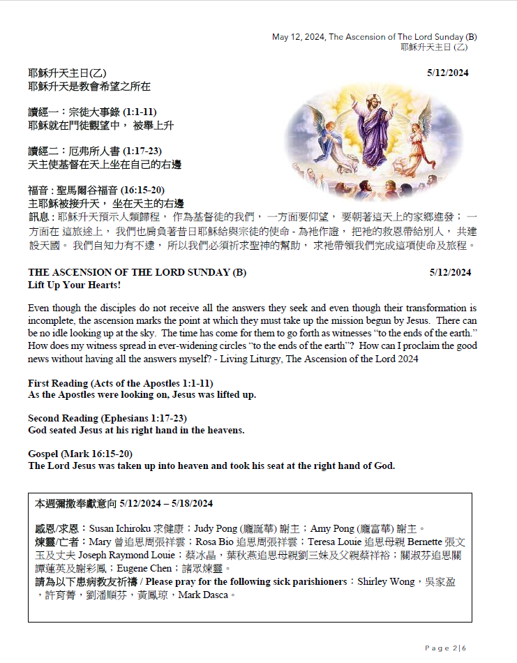 耶穌升天主日 (乙) The Ascension of The Lord Sunday (B) 5-12-2024