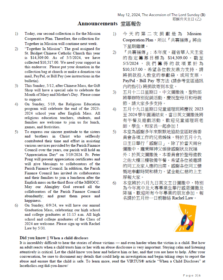 2)“Together In Mission”: The goal assigned for St. Bridget Chinese Catholic Church this year is $14,309.00. As of 5/5/2024, we have collected $10,517.00. We need your support in this endeavor. Please put your donation in the collection bag at church or make a donation via mail, PayPal, or Bill Pay (see instructions in the bulletin).