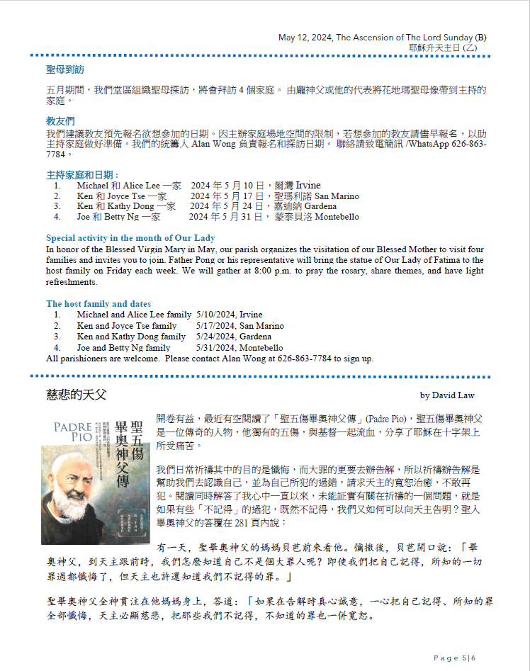 5)To express our sincere gratitude to the sisters and brothers in Christ who selflessly contributed their time and effort in assisting various services provided by the Parish Finance Council over the years, our parish will hold an “Appreciation Day” on 5/19/2024. Fr. Peter Pong will present appreciation certificates and will give blessings to collaborators of the Parish Finance Council. In addition, the Parish Finance Council has invited its collaborators and their families to join a luncheon after the English mass on the third floor of the MHOCC. May our Almighty God reward all the collaborators of the Parish Finance Council abundantly; and grant them peace and happiness.