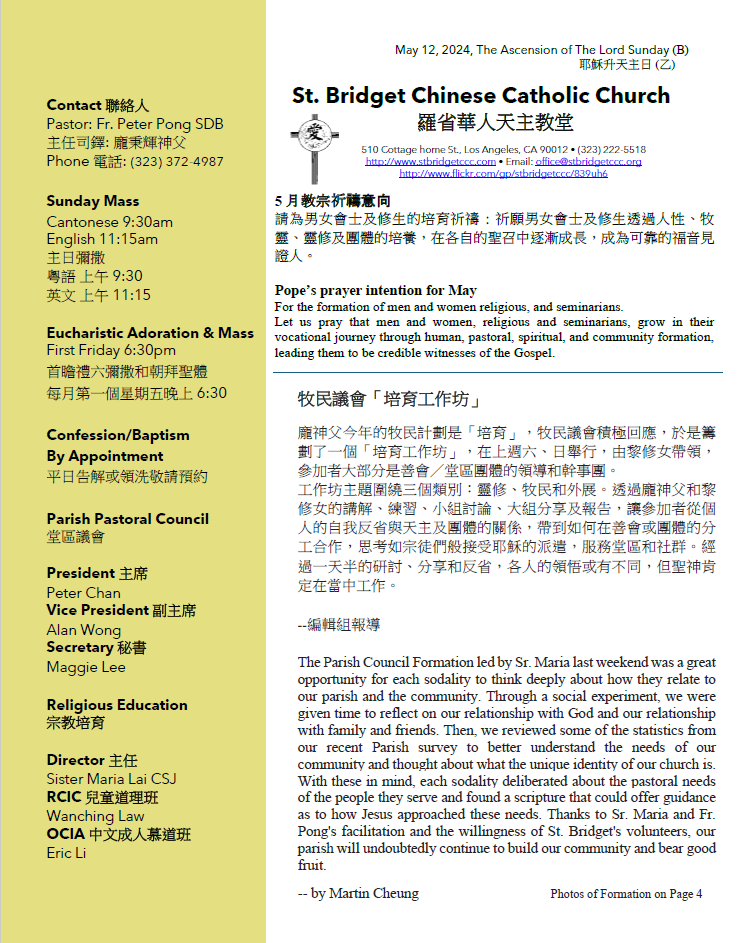 2)“Together In Mission”: The goal assigned for St. Bridget Chinese Catholic Church this year is $14,309.00. As of 5/5/2024, we have collected $10,517.00. We need your support in this endeavor. Please put your donation in the collection bag at church or make a donation via mail, PayPal, or Bill Pay (see instructions in the bulletin).