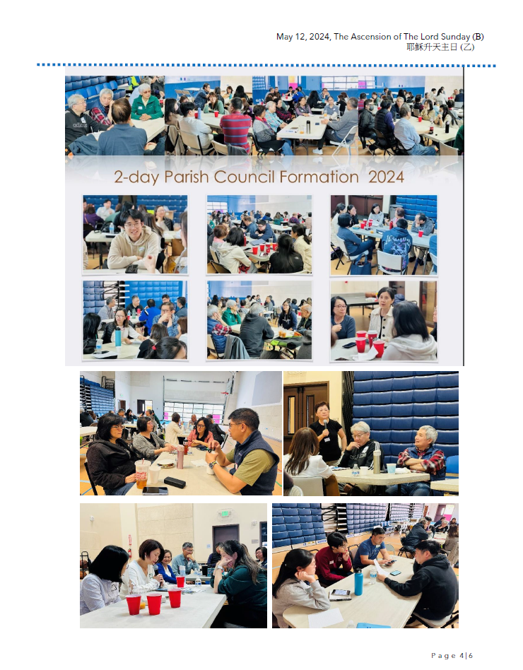 5)To express our sincere gratitude to the sisters and brothers in Christ who selflessly contributed their time and effort in assisting various services provided by the Parish Finance Council over the years, our parish will hold an “Appreciation Day” on 5/19/2024. Fr. Peter Pong will present appreciation certificates and will give blessings to collaborators of the Parish Finance Council. In addition, the Parish Finance Council has invited its collaborators and their families to join a luncheon after the English mass on the third floor of the MHOCC. May our Almighty God reward all the collaborators of the Parish Finance Council abundantly; and grant them peace and happiness.