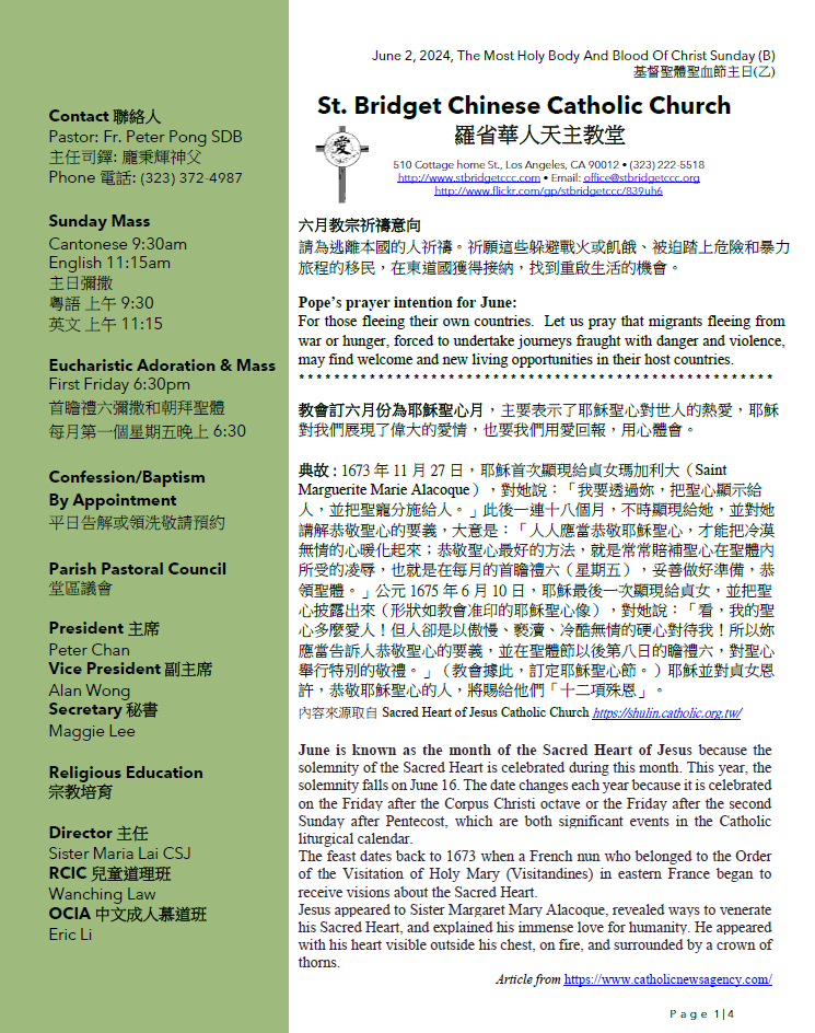 1)Together In Mission: The goal assigned for St. Bridget Chinese Catholic Church this year is $14,309.00. As of 5/26/2024, we have collected $14,309.00, totally completing our goal. Thanks for your support in this endeavor.
