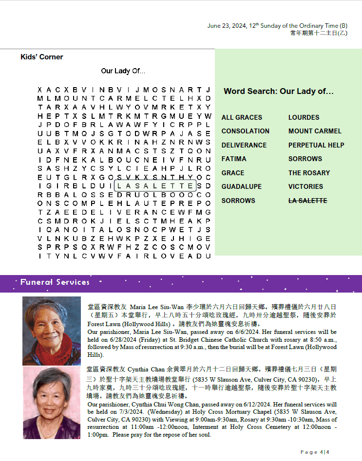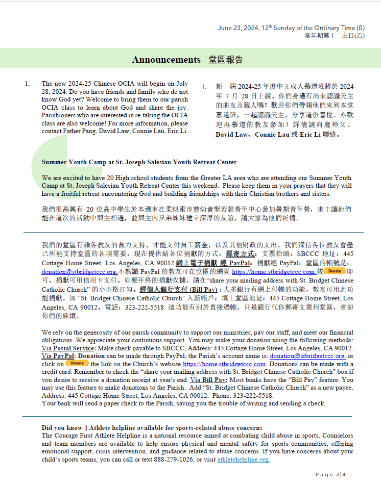 1.新一屆 2024-25 年度中文成人慕道班將於2024年7月28日上課。你們身邊有尚未認識天主的朋友及親人嗎?歡迎你們帶領他們來到本堂慕道班,一起認識天主,分享這份喜悅。亦歡迎再慕道的教友參加!詳情請向龐神父、David Law、Connie Lau 或 Eric Li 聯絡。