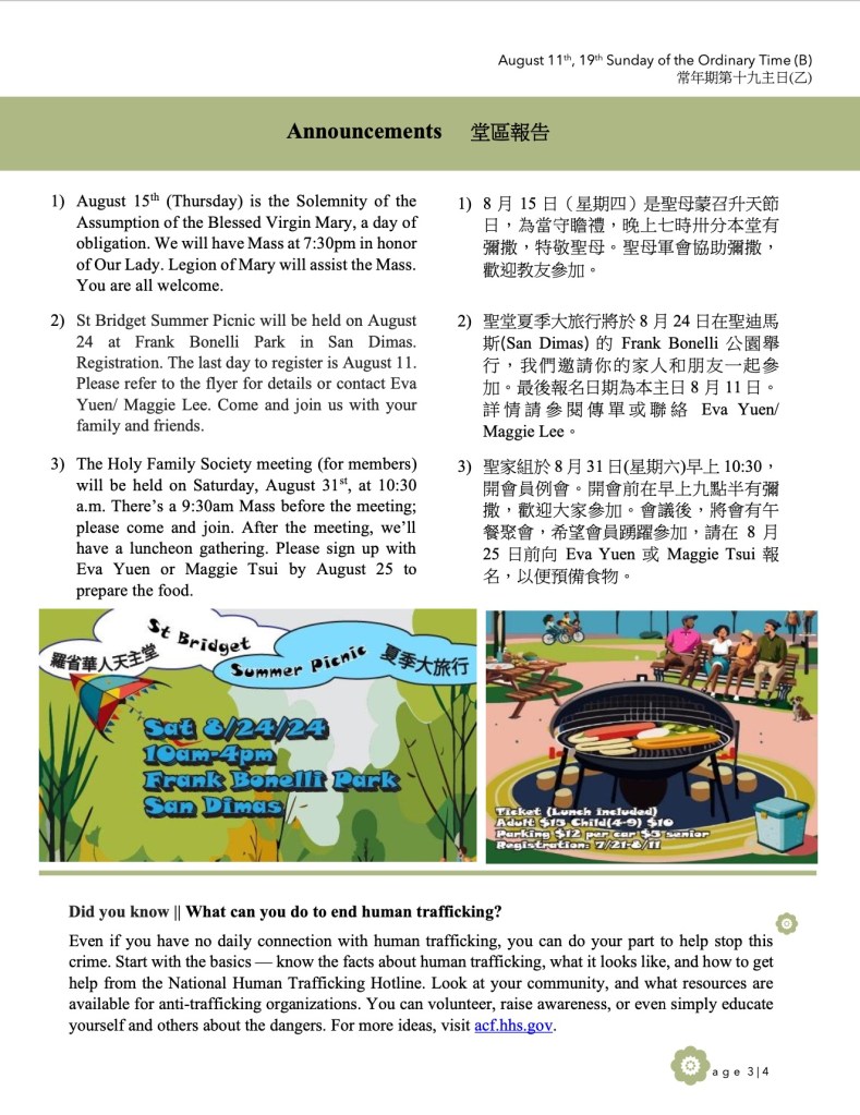 | 1. August 15th (Thursday) is the Solemnity of the Assumption of the Blessed Virgin Mary, a day of obligation. We will have Mass at 7:30pm in honor of Our Lady. Legion of Mary will assist the Mass. You are all welcome. 2. St Bridget Summer Picnic will be held on August 24 at Frank Bonelli Park in San Dimas. Registration. The last day to register is August 11. Please refer to the flyer for details or contact Eva Yuen/ Maggie Lee. Come and join us with your family and friends. 3. The Holy Family Society meeting (for members) will be held on Saturday, August 31st, at 10:30 a.m. There’s a 9:30am Mass before the meeting; please come and join. After the meeting, we’ll have a luncheon gathering. Please sign up with Eva Yuen or Maggie Tsui by August 25 to prepare the food. 1. 8月15日(星期四)是聖母蒙召升天節日,為當守瞻禮,晚上七時卅分本堂有彌撒,特敬聖母。聖母軍會協助彌撒,歡迎教友參加。 2. 聖堂夏季大旅行將於 8 月 24 日在聖迪馬斯(San Dimas) 的 Frank Bonelli 公園舉行,我們邀請你的家人和朋友一起參加。最後報名日期為本主日8 月11日。詳情請參閱傳單或聯絡 Eva Yuen/ Maggie Lee。 3. 聖家組於8月31日(星期六)早上10:30,開會員例會。開會前在早上九點半有彌撒,歡迎大家參加。會議後,將會有午餐聚會,希望會員踴躍參加,請在8月25日前向Eva Yuen或Maggie Tsui報名,以便預備食物。 |