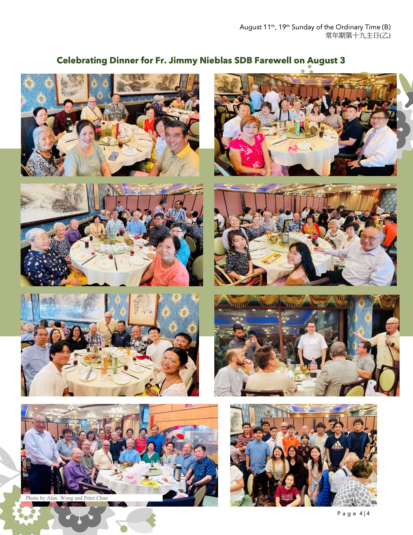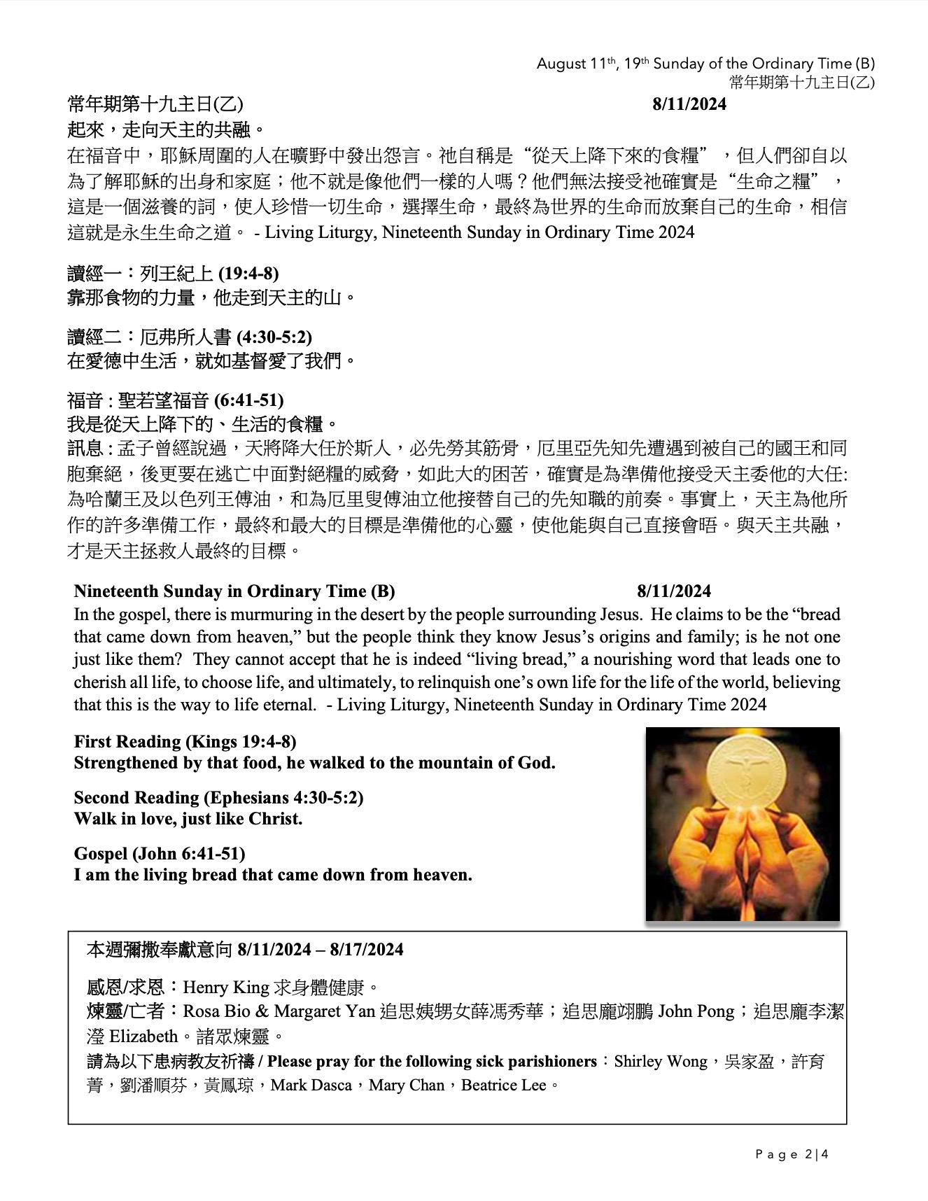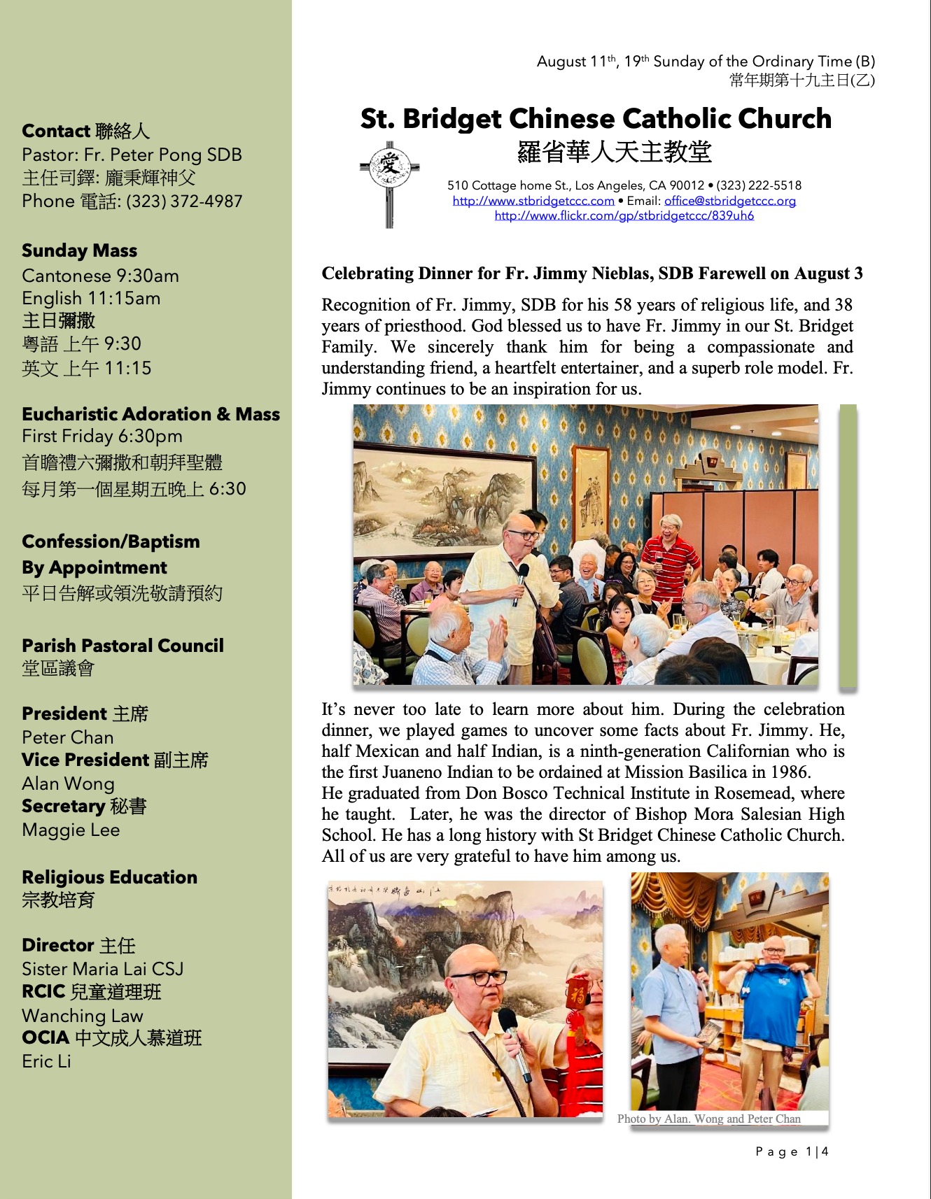 | 1. August 15th (Thursday) is the Solemnity of the Assumption of the Blessed Virgin Mary, a day of obligation. We will have Mass at 7:30pm in honor of Our Lady. Legion of Mary will assist the Mass. You are all welcome. 2. St Bridget Summer Picnic will be held on August 24 at Frank Bonelli Park in San Dimas. Registration. The last day to register is August 11. Please refer to the flyer for details or contact Eva Yuen/ Maggie Lee. Come and join us with your family and friends. 3. The Holy Family Society meeting (for members) will be held on Saturday, August 31st, at 10:30 a.m. There’s a 9:30am Mass before the meeting; please come and join. After the meeting, we’ll have a luncheon gathering. Please sign up with Eva Yuen or Maggie Tsui by August 25 to prepare the food. 1. 8月15日(星期四)是聖母蒙召升天節日,為當守瞻禮,晚上七時卅分本堂有彌撒,特敬聖母。聖母軍會協助彌撒,歡迎教友參加。 2. 聖堂夏季大旅行將於 8 月 24 日在聖迪馬斯(San Dimas) 的 Frank Bonelli 公園舉行,我們邀請你的家人和朋友一起參加。最後報名日期為本主日8 月11日。詳情請參閱傳單或聯絡 Eva Yuen/ Maggie Lee。 3. 聖家組於8月31日(星期六)早上10:30,開會員例會。開會前在早上九點半有彌撒,歡迎大家參加。會議後,將會有午餐聚會,希望會員踴躍參加,請在8月25日前向Eva Yuen或Maggie Tsui報名,以便預備食物。 |