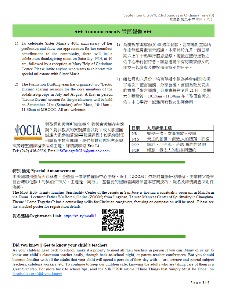 1)為慶祝黎潔雲修女40 週年發願,並向她對堂區所作出無私貢獻表示感謝,本堂將於九月十四日星期六上午十點舉行感恩聖祭,隨後在聖母進教之佑中心舉行招待會。誠意邀請所有認識黎修女的朋友一起參與及慶祝這個特別的日子。