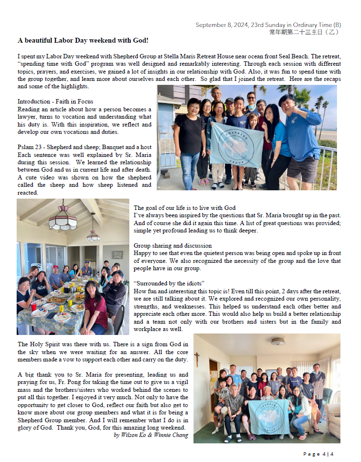 2)The Formation Drafting team has organized two “Lectio Divina” sharing sessions for the core members of the sodalities/groups in July and August, A first in-person “Lectio Divina” session for the parishioners will be held on September 21st (Saturday) after Mass, 10:15am -11:30am at MHOCC. All are welcome.